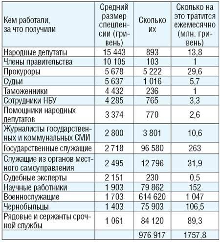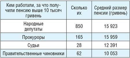Четвертая идея – ограничить размер специальных пенсий. По данным, добытых нами из Пенсионного фонда с помощью депутата Владимира Арьева (экс-коллега все-таки), на 1 января в Украине было 12,5 млн. простых пенсионеров. Их пенсии в среднем составляли 874 гривни. А еще был 1 млн. специальных пенсионеров. И зарабатывали они: