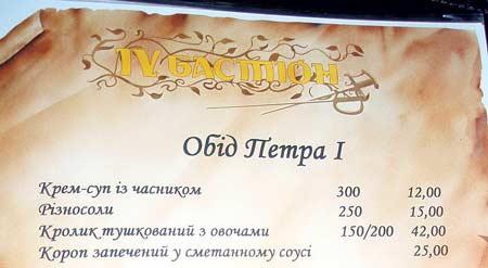 В ресторанах Полтави в меню з‘явилися «Обід Карла» та «Обід Петра». Так, у ресторані «Четвертий бастіон» гостей зустрічають манекени у формі російських солдат, а на обід можна замовити спецстраву «Редут», «Гармата» та інші. Серед найбільш популярних «Обід Карла» ( рибний суп по-королівськи за 20 грн, запечена картопля з червоною ікрою за 25 грн, салат з овочів і креветок за 15 грн та форель, запечена з овочами за 45 грн), «Обід Петра» (різносоли під горілку за 15 грн, крем-суп часниковий за 12 грн, крільчатина з овочами за 42 грн та короп, запечений у сметані, за 25 грн) та «Шашлик Мазепи» з овочевим гарніром, який затягне на 58 грн.