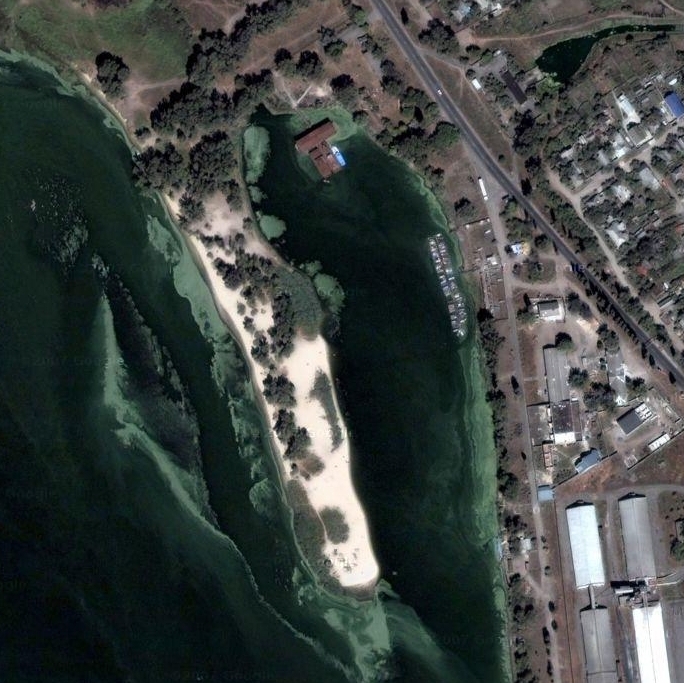 Стара фотографія Затону з супутника. На ній видно піщані пляжі, де купалися кременчужани, та дерева, в тіні яких вони ховалися від спеки. Исполь зована карта Google.