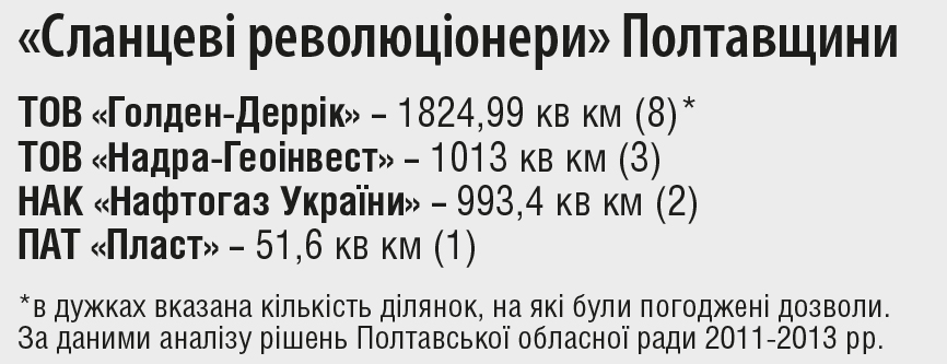 Якби не широкий піар сланців, то ми б і не дізналися, що на Полтавщині ця «революція» почалася ще у вересні 2011 року. Саме тоді Полтавська обласна рада погодила отримання дозволів ТОВ «Надра-Геоінвест» та ТОВ «Голден Деррік» на геологічне вивчення та видобування сланцевого газу. Першим надали 499,5 кв км у Лохвицькому районі, а другим – 164,4 кв км у Новосанжарському. З того часу обласна рада погодила ще 12 дозволів. Наразі «сланцевою революцією» охоплена 1/7 території Полтавщини – 3,88 тисяч квадратних кілометрів. Підприємці шукають газ, не так гучно, як Shell та Сhevron. Найближчі ділянки – у Кобеляцькому, Новосанжарському та Решетилівському районах. Якісь 60 км від Кременчука.