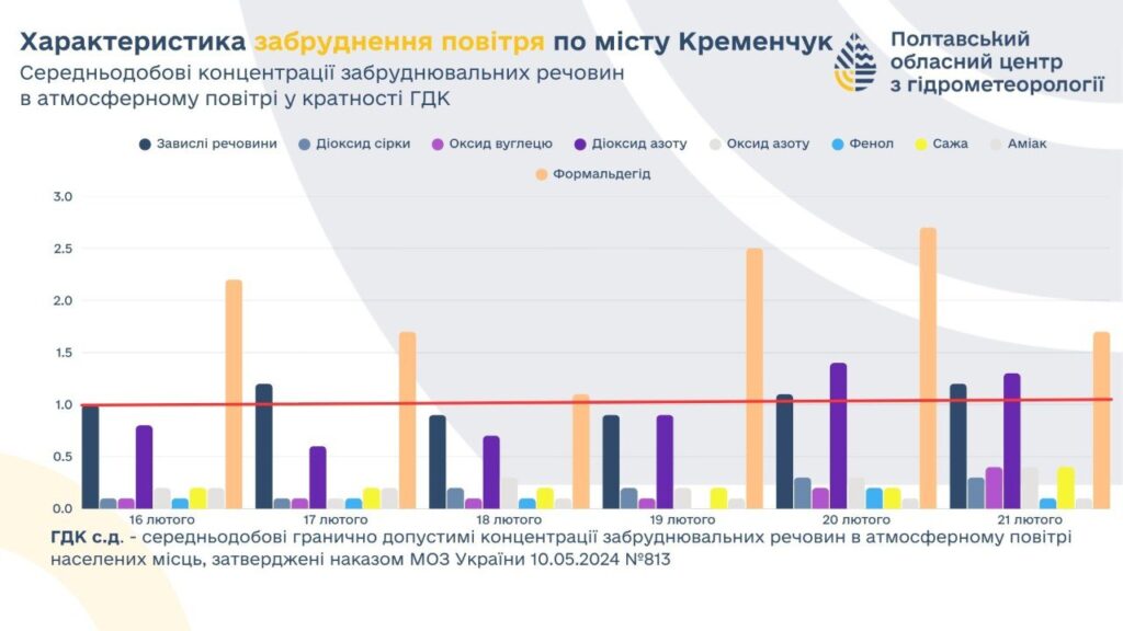 Упродовж 16–21 лютого 2026 року в атмосферному повітрі Кременчука зафіксували перевищення середньодобових гранично допустимих концентрацій забруднювальних речовин. Про це повідомляє Полтавський обласний центр з гідрометеорології. Зокрема, підвищений вміст недиференційованого пилу спостерігали 17, 20 та 21 лютого, діоксиду азоту — 20 і 21 лютого, а концентрація формальдегіду перевищувала норму протягом усього тижня.