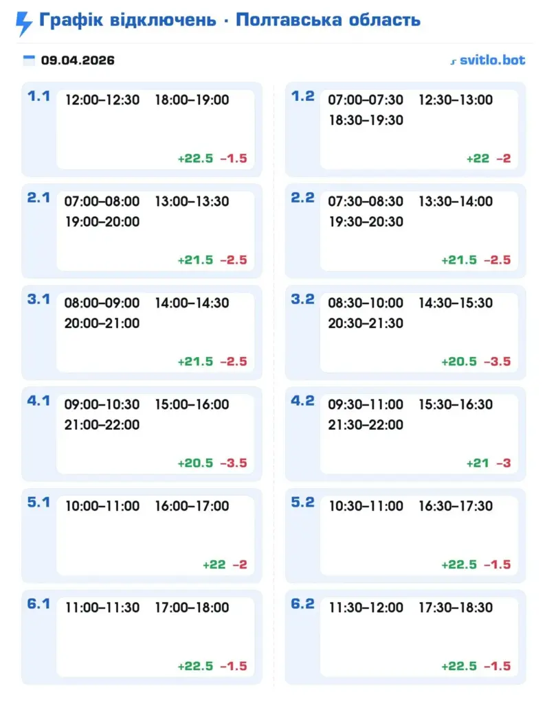 ПАТ «Полтаваобленерго» повідомило, що у зв’язку зі складною ситуацією в енергосистемі України, в Полтавській області у четвер, 9 квітня, буде застосовано графік погодинних відключень (ГПВ) електроенергії.