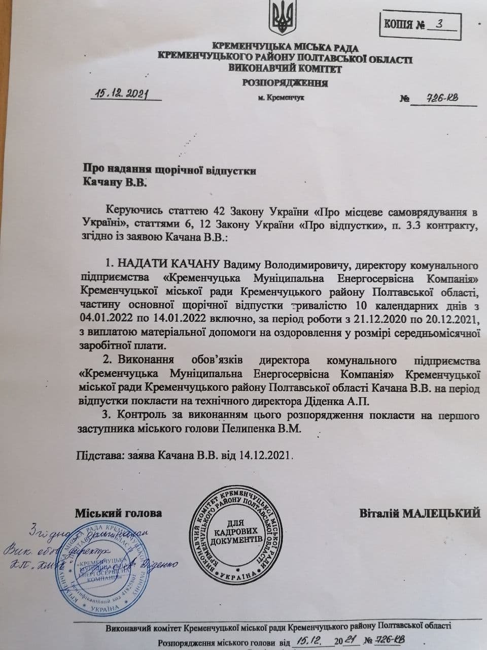 Зате керівник КП КМЕК Вадим Качан отримував за свою роботу премії — а на кінець року міський голова ще й розпорядився дати грошей йому на оздоровлення. Ось розпорядження, яке я отримала разом з відзивом на позов (так у КМЕК пояснили те, що документ підписав не Качан, а його заступник).