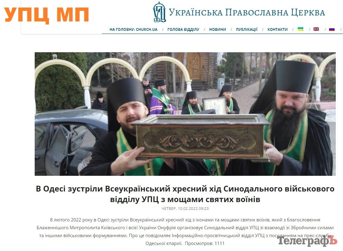 Цитата з сайту УПЦ МП: «8 лютого 2022 року в Одесі зустріли Всеукраїнський хресний хід з іконами та мощами святих воїнів, який з благословення Блаженнішого Митрополита Київського і всієї України Онуфрія організовує Синодальний відділ УПЦ зі взаємодії зі Збройними силами та іншими військовими формуваннями».