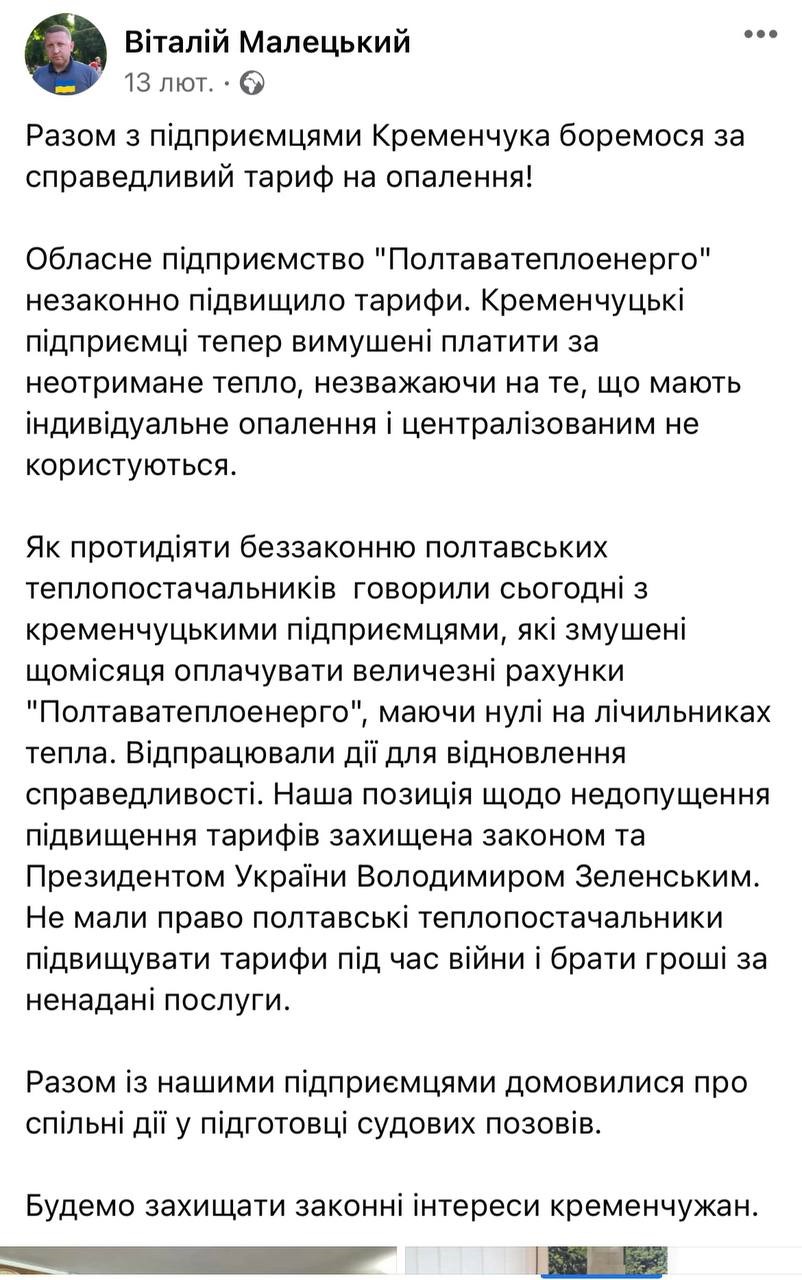 13 лютого, міський голова, відзвітував своїм підлизникам, що провів зустріч з підприємцями Кременчука. Як вбачається з допису мера, представники бізнесу вимушені платити за неотримане тепло, щомісяця сплачуючи рахунки «Полтаватеплоенерго», маючи нулі своїх лічильників тепла. Ну і звичайно, вже традиційна, апеляція до Президента Володимира Зеленського. Звичайно ні пари з вуст про власне підприємство. Взагалі не зрозуміло, про що саме говорив Малецький з ошуканими людьми.