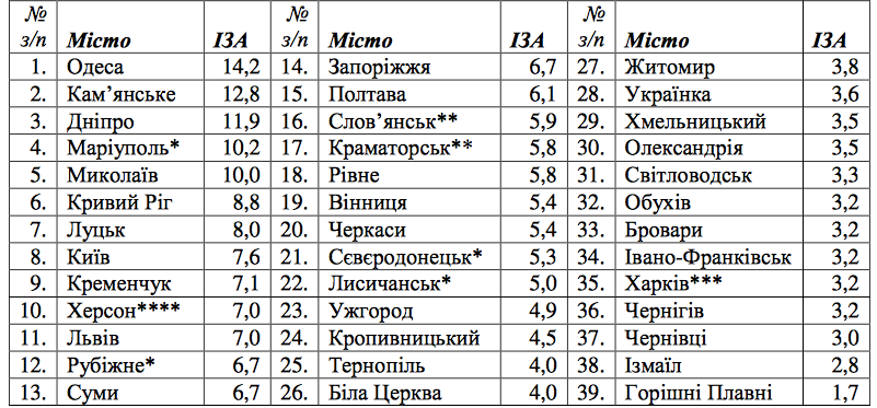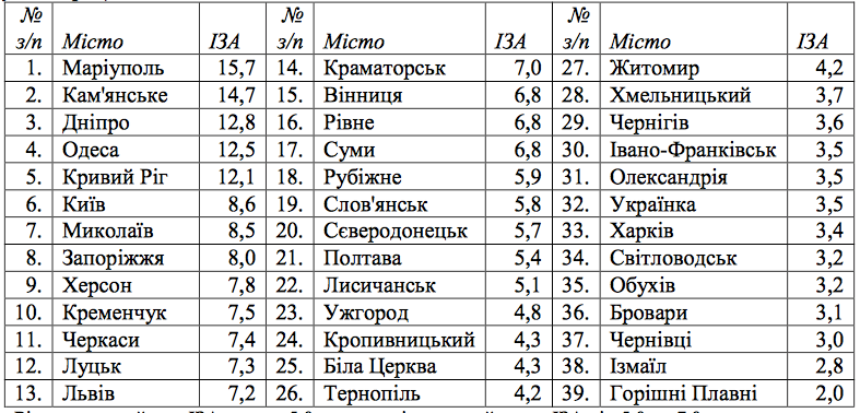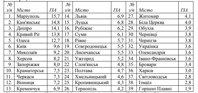 У наведеній таблиці містяться значення індексу забруднення атмосферного повітря у 2020 році для усіх міст України, де проводять спостереження гідрометеорологічні організації. Що ж стосується самого ІЗА (індексу забруднення атмосфери), то він враховує ступінь забруднення атмосферного повітря по п’яти пріоритетних забруднювальних домішках. Високий рівень забруднення атмосферного повітря вказаних міст був обумовлений здебільшого підвищеним вмістом специфічних шкідливих речовин — формальдегіду, фенолу, фтористого водню, аміаку, з основних домішок — діоксиду азоту, завислих речовин, оксиду вуглецю. Не важко здогадатися, що більшість з цих шкідливих речовин є викидами, що є наслідком діяльності підприємств нафтопереробної галузі.