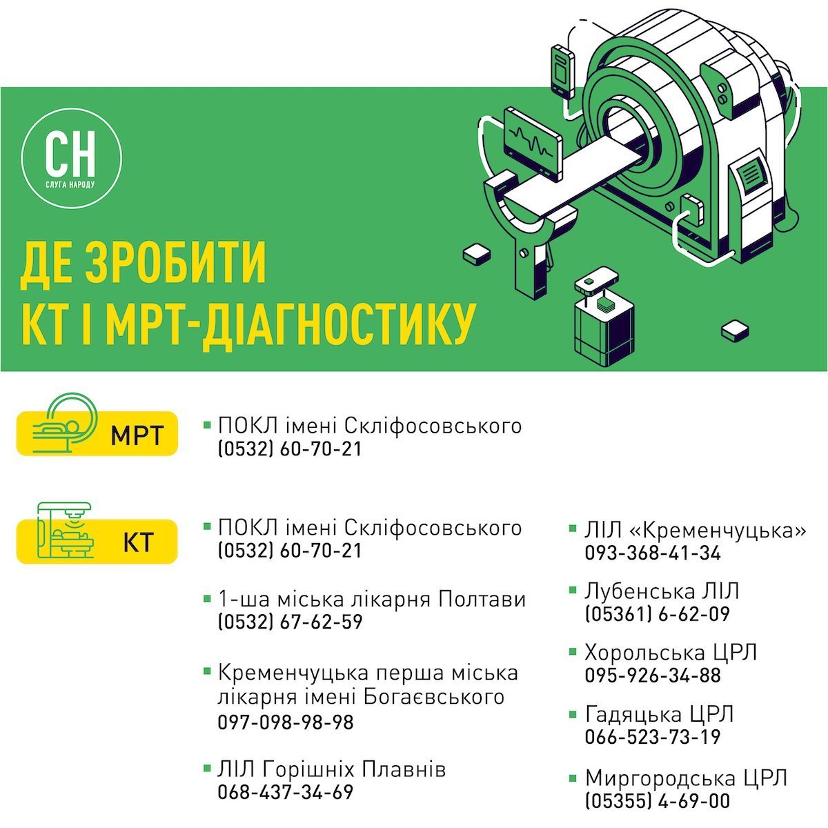 Комп’ютерну томографію роблять дев’ять медзакладів області: Кременчуцька перша міська лікарня імені Богаєвського, ЛІЛ «Кременчуцька», ПОКЛ імені Скліфосовського, 1-ша міська лікарня Полтави, ЛІЛ Горішніх Плавнів, Лубенська ЛІЛ, Хорольська ЦРЛ, Гадяцька ЦРЛ, Миргородська ЦРЛ. Усе це – аби діагностичні послуги для мешканців регіону були доступними, і пацієнтам – як цивільним, так і військовим – не доводилося їхати до обласного центру, щоб зробити КТ.