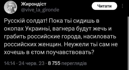 Є у кримінальної революції початок — немає у кримінальної революції кінця. Принаймні, цей кінець на росії буде не скоро. Її президент намагається зупинити головного «пахана» росії та його поплічників силами кримінальників. З’явилася інформація, що по російським зонам пройшов «прогон» від «крадіїв у законі», в якому вони закликають «братву» до бунту. А президенту московії довелося піти на «договорняк» з головним бунтівником і «паханом» росії євгенієм пригожиним: пробачати йому збройний заколот, 6-ть збитих гвинтокрилів та військовий літак, і запропонувати виїхати до білорусі. Це якийсь сюр... Кінцівка першої серії вийшла якоюсь неправдоподібною та, навіть, трохи смішною. А перший варіант військового перевороту та громадянської війни на росії - пробним. Отже, запасаємося поп-корном та дивимося наступну серію блокбастеру про рф та тепер вже і про білорусь.