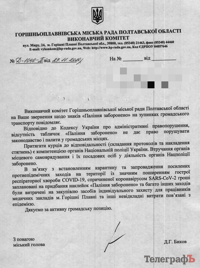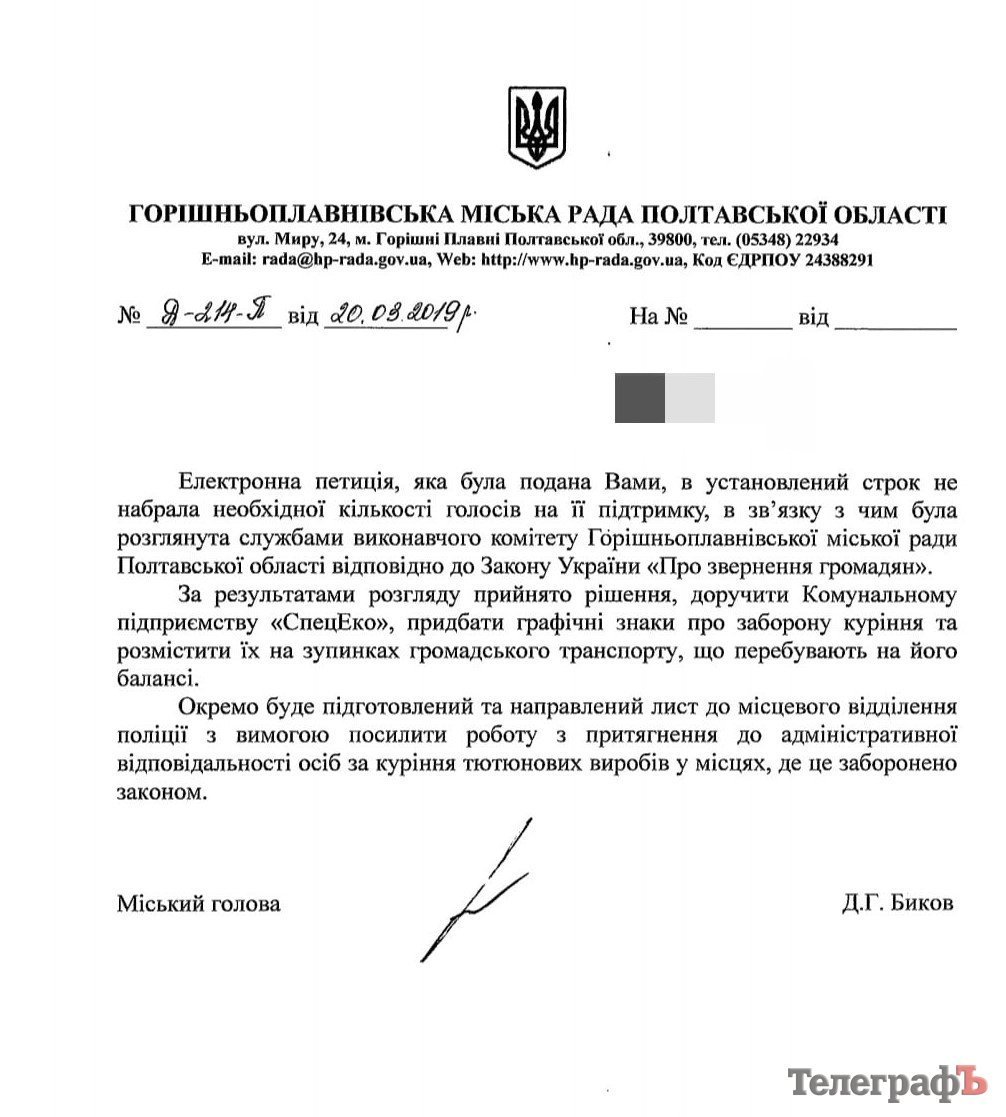 На електронну петицію щодо облаштування зупинок громадського транспорту м. Горішні Плавні знаками заборони куріння, відповідно до чинного законодавства України, отримав позитивну відповідь від місцевої влади: