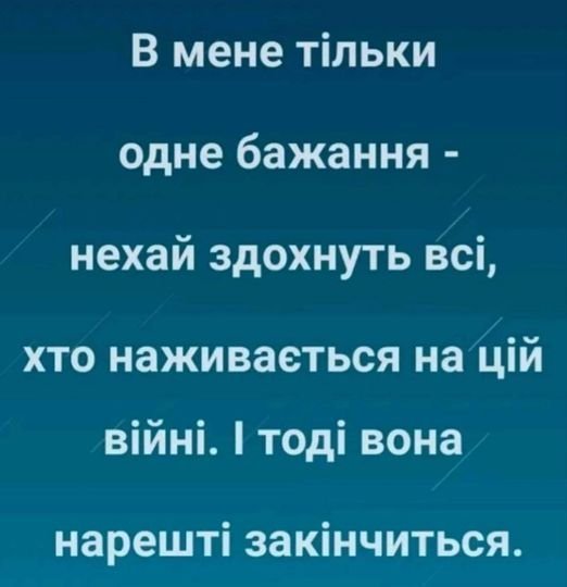 Ще один схожий наратив, з не меншим емоційним забарвленням. Людина читає це речення і, звісно, обурюється діями тих, хто наживається на війні. А заодно «ковтає» й другу частину гасла — якщо вони «здохнуть», то і війна «нарешті закінчиться»… Не коли здохне Путін та розвалиться Росія, а саме коли здохнуть «вони».