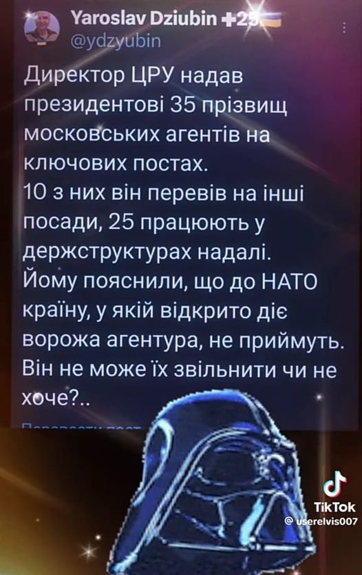 Отаке — Ярослав Дзюбін звідкись «дізнався», що директор ЦРУ надав президенту прізвища московських агентів. До того йому стало відомо, що десятьох з них глава держави перевів на інші посади, а 25 продовжують працювати на старих. А ще він знає, що саме через це Україну не приймають до НАТО!