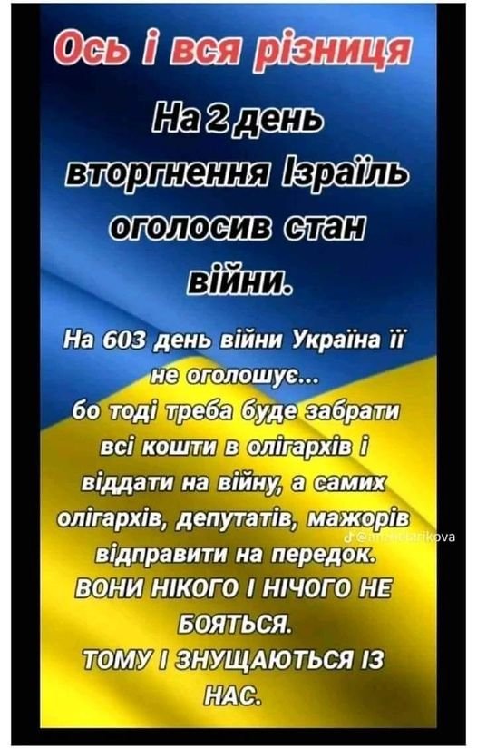 Що ж до прикладу Ізраїлю, то він тут просто недоречний. Хіба Ізраїль воює з країною, що має найбільший ядерний арсенал у світі, та в декілька разів більший за Ізраїль по своїм ресурсам та військовій спроможності? Ні, Ізраїль воює з терористичною організацією, яку підтримує лише декілька країн — традиційних ворогів Ізраїлю. При цьому має потужну підтримку усього Заходу.