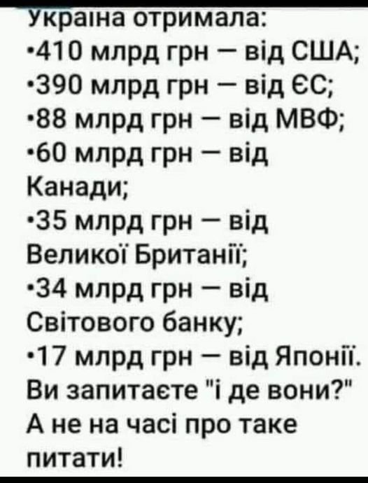 Розповсюджувачам цієї картинки явно невідомо, що усі податки, які збираються в Україні, зараз йдуть на утримання армії. І їх на це не вистачає. Усі ж інші галузі — від утримання бюджетників, лікарів, вчителів до виплати соцдопомог та субсидій Пенсійним фондом фінансується коштом іноземної допомоги. І так протягом двох останніх років. На жаль, про це не знає й багато українців, які радісно лайкають, перепощують та обурюються, чому ці мільярди допомоги «не дійшли до них». І навіть не задумуються, яким коштом вони останні два роки самі отримують щомісячну зарплату, субсидію чи пенсію.