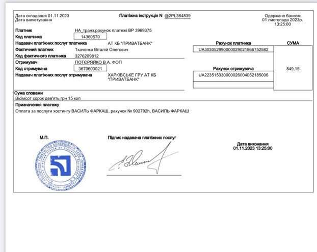 Інше, що не опосередковано вказує на причетність працівників Комунальної телерадіокомпанії до діяльності ворожого інтернет видання “КременчукТудей” є ще платіжна інструкція, де платіж здійснила фізична особа.