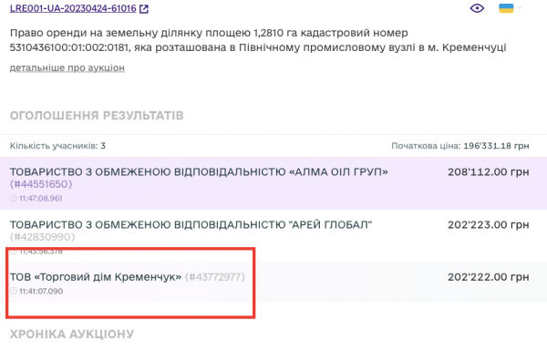 Право оренди найбільшої земельної ділянки (надалі уклавши відповідний договір) площею 7,00 га з умовним позначенням № 1 ТОВ «Алма Оіл Груп», отримало шляхом участі в аукціоні. Даний аукціон, організатором якого була Кременчуцька міська рада, містить ознаки фіктивності й заздалегідь обумовлених спільниками правил, проходив за участі ще двох учасників земельних торгів, а саме: ТОВ «Авіо Оіл» та ТОВ «Арей Глобал». Інформація, щодо даних учасників міститься все в тих же ухвалах слідчих-суддів в Єдиному реєстрі судових рішень, де зазначено, що від реалізації паливно-мастильних матеріалів в адресу ряду суб`єктів господарської діяльності (контрагентів), в тому числі підприємств з ознаками фіктивності: (у т. ч. ТОВ «Авіо Оіл» та ТОВ «Арей Глобал»), підприємством зі складу «організованої групи», були отримані грошові кошти. Що було далі та в чому їх звинувачують ви вже добре знаєте. Зрозуміло, що переможцем аукціону було визнано ТОВ «Алма Оіл Груп».