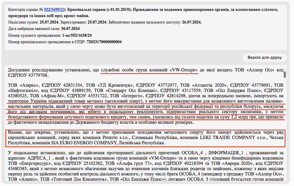 Виникає інше запитання: а де ж взагалі поділася інша історія пов’язана з колабораціонізмом? Не дарма ж справа, яку починали розслідувати детективи Територіального управління БЕБ у Полтавській області, перекочувала до слідчого управління УСБУ в Полтавській області. Орган досудового розслідування змінився, адже в масиві ухвал слідчих-суддів, чорним по білому фігурувала ч. 4 ст. 111-1 КК України. В нашому контексті, мова про провадження господарської діяльності у взаємодії з державою-агресором. Текст частини з більш ніж 130 ухвал слідчих-суддів, що маються у відкритому доступі Єдиного державного реєстру судових рішень, здавалося, містив вичерпну інформацію з описом схеми завезення нафтопродуктів (метанолу під виглядом розчинника) і їх подальшого використання для підвищення октанового числа пального, з метою його реалізації в реальному секторі української економіки.