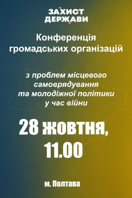 28 жовтня у Полтаві відбудеться конференція громадських організацій, присвячена проблемам місцевого самоврядування та молодіжної політики в умовах війни.Організатор — ГО «Захист держави».