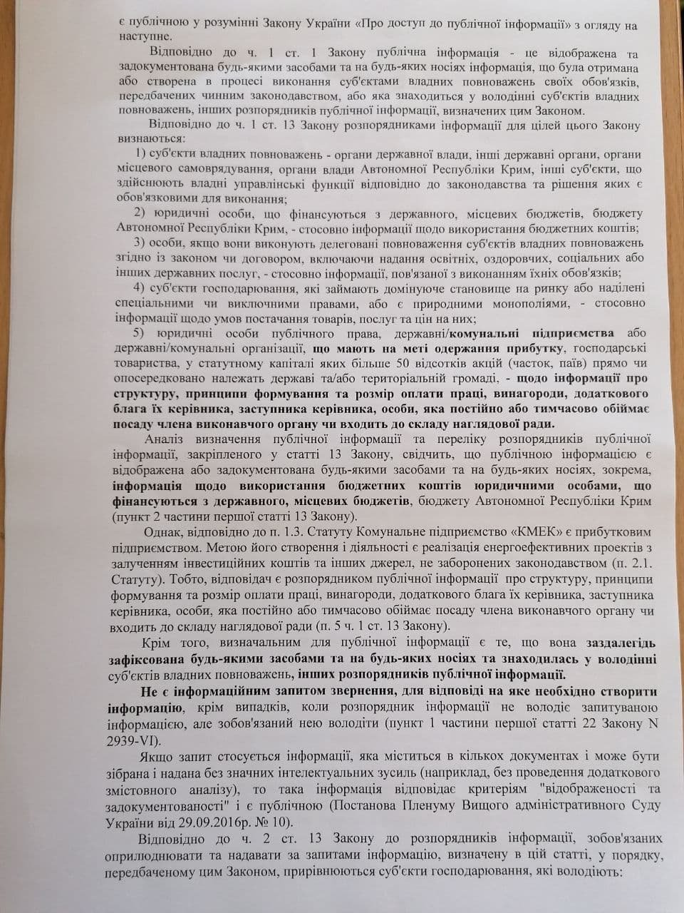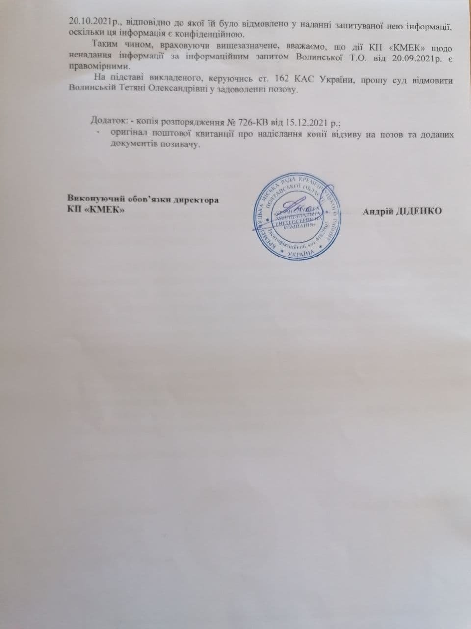 Ще трішки деталей. Уже після того, як суд виніс рішення, я отримала поштою відзив на позов від КП КМЕК (такий документ надається у суд). У ньому — все та ж неоковирна прутня про те, що запитувана мною інформація не є публічною, а запит — взагалі не запит (кому цікаво, документ у фотоблоці). Крім договору, я просила відомості про його виконання за 1-й та 2-й квартали 2021 року. І тут починається найцікавіше. У відзиві говориться: