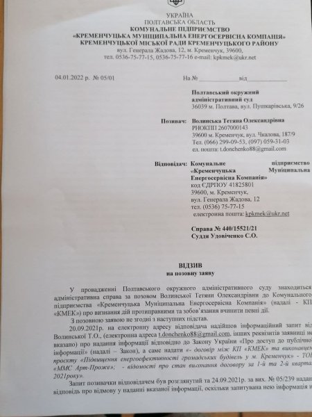 Сьогодні я дізналася, що виграла позов до КП КМЕК. У паперовому вигляді ухвалу Полтавського окружного адміністративного суду ще не отримала. Але текст її (від 10.01.22 р.) доступний у Єдиному державному реєстрі судових рішень.