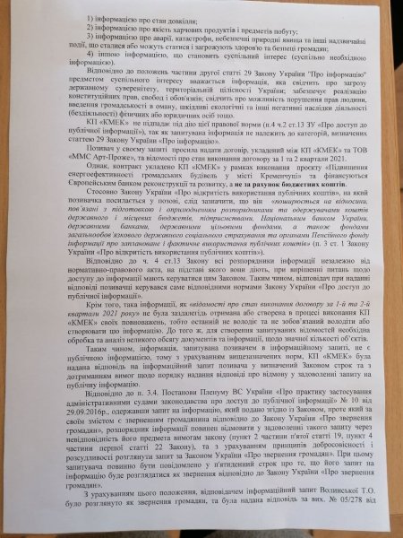 Коротко нагадаю: комунальне підприємство «Кременчуцька муніципальна енергосервісна компанія» (КП КМЕК) відмовило у наданні інформації на мій запит. Якось вони там подумали — і вирішили собі самі, що договір на термомодернізацію громадських будівель вартістю 10 млн євро не є публічною інформацією. І пофіг на те, що це кредитні гроші ЄБРР — і віддаватиме їх громада міста з бюджету; і пофіг на суспільний інтерес, який виявляли до проєкту батьки вихованців зачинених на той момент дитсадків.