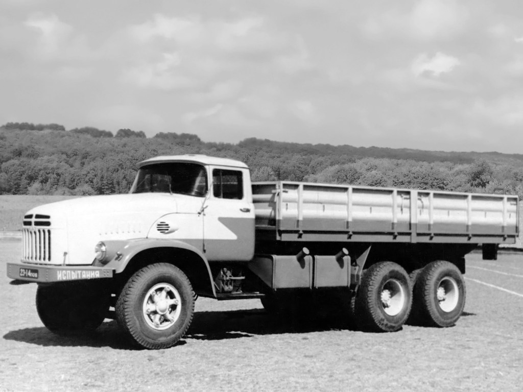 1959 год. На фото КрАЗ-256 с платформой от самосвала КрАЗ-222 (переходная модель). На автомобилях первого семейства стояла определенная шина (обратите внимание на рисунок протектора шин КрАЗ-222 на фото), следующие модели, начиная с 256-й, уже были на других шинах.