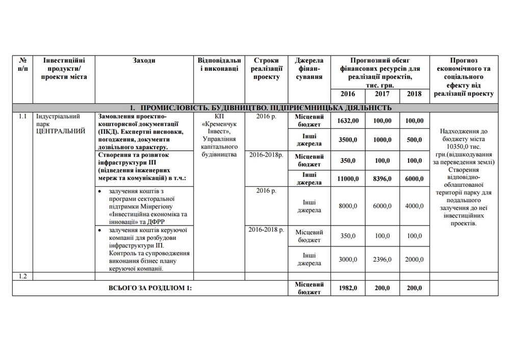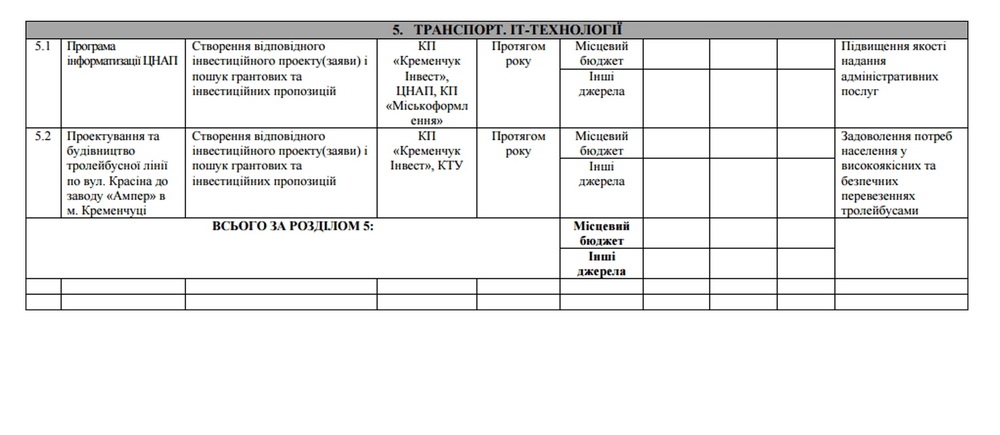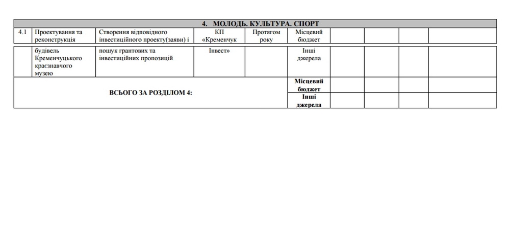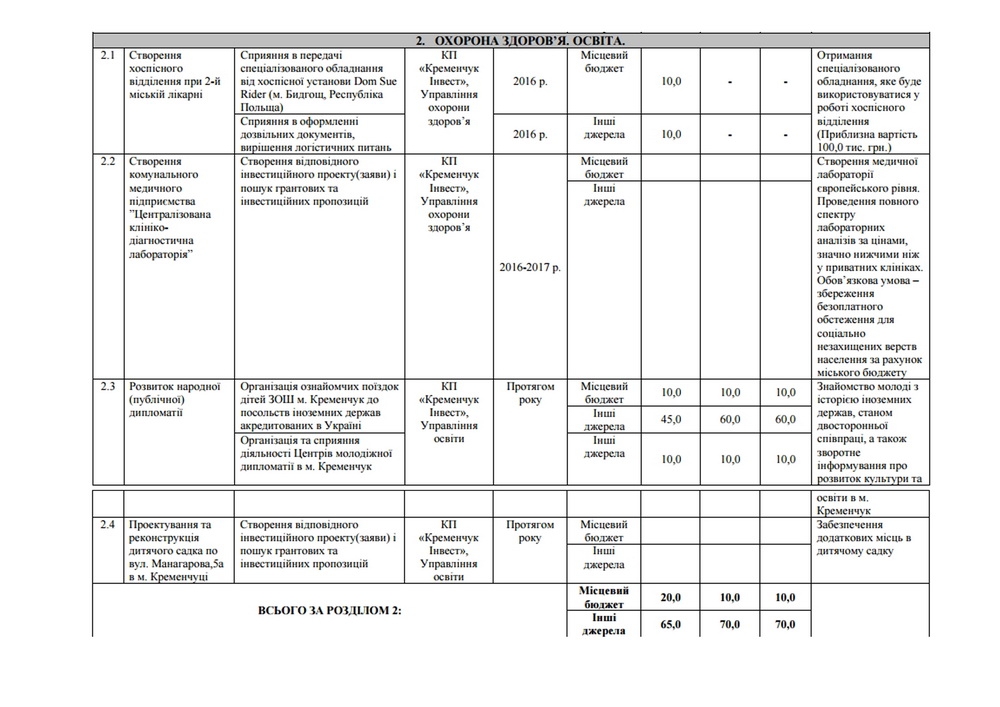 И вот 5 января «Кременчуг Инвест» представил участникам расширенного совещания детализированный проект мероприятий городской инвестпрограммы на 2016-2018 гг. Среди предлагаемых мероприятий были такие экстравагантные, как проектирование троллейбусной линии до завода «Ампер» и проектирование и реконструкция зданий Кременчугского краеведческого музея (в котором капремонт длится восьмой год). «Кременчуг Инвест» брался найти инвесторов для этих проектов и разработать техническую документацию.
