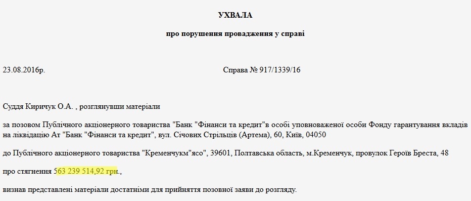 23 августа хозяйственный суд Полтавской области принял к рассмотрению иск Фонда гарантирования вкладов к ПАО «Кременчугмясо» относительно взыскания с предприятия 563 млн 239 тыс 514 грн 92 коп.