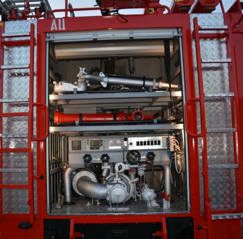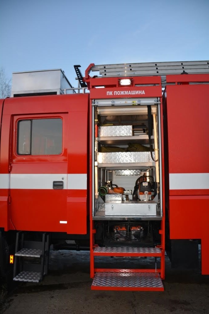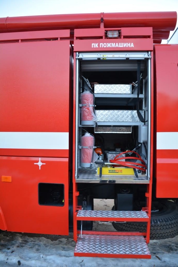 Автомобиль укомплектован оборудованием пожарно-технического вооружения, находящимся в специальных отсеках, закрывающихся гофрированными шторками.