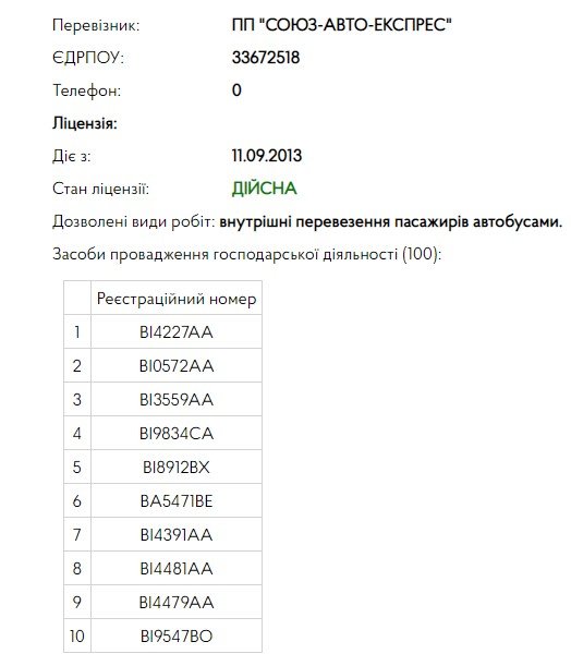 Итак, мы убедились, что у перевозчика есть действительная лицензия на внутренние перевозки пассажиров. И в его пользовании находится 100 транспортных средств (номера выдаются по 10 на страницу, затем можно пересматривать дальше).