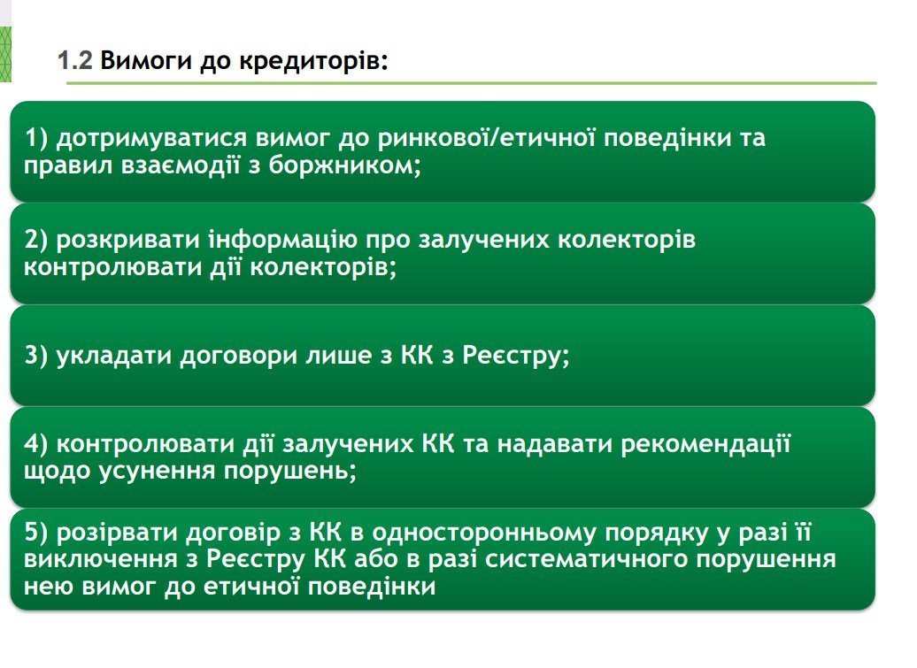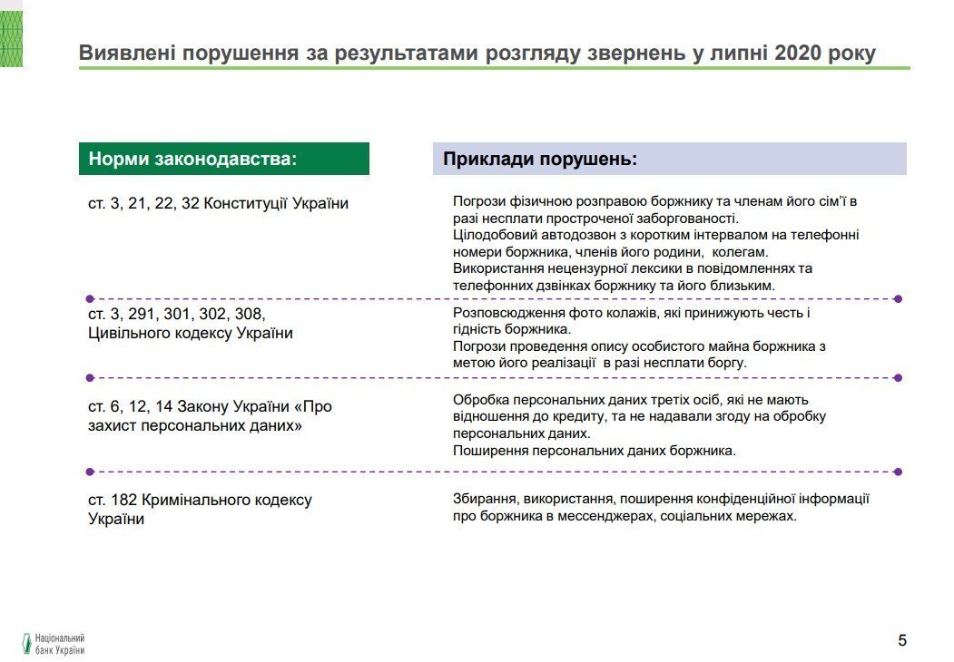 Наразі НБУ представив концепцію регулювання колекторської діяльності. У презентації є й перелік порушень Конституції України та інших законів, до яких вдаються колектори зараз:
