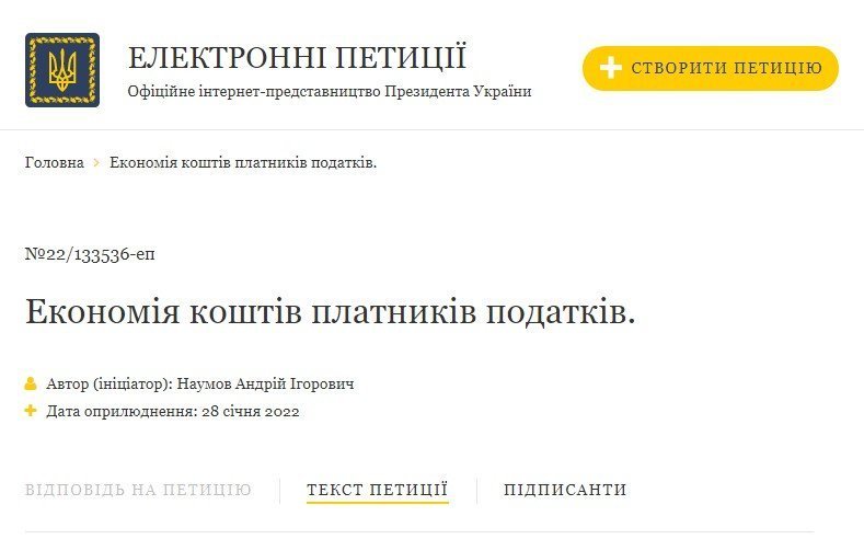 На сайті Президента України розміщена петиція «Економія коштів платників податків». Її автор, кременчужанин Андрій Наумов, звернувся до Т – щоб через наше видання попросити підтримки містян, не байдужих до проблеми, яку він порушує. Поки що станом на 30 січня петиція набрала 111 голосів, а для розгляду Президентом необхідно 25000.