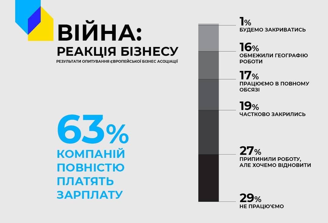 - 52% українських компаній хоч і з обмеженнями, але працюють. Ще 27% призупинили, але хочуть відновлювати свою діяльність.