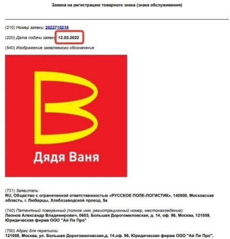 У російській федерації вирішили зареєструвати новий товарний знак – «Дядя Ваня», який дуже схожий на логотип всесвітньої мережі ресторанів швидкого харчування McDonald’s, що покинула територію РФ.