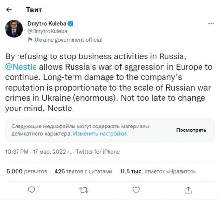 Глава МЗС України Дмитро Кулеба пропонує компанії Nestle переглянути позицію щодо продовження підприємницької діяльності у РФ.