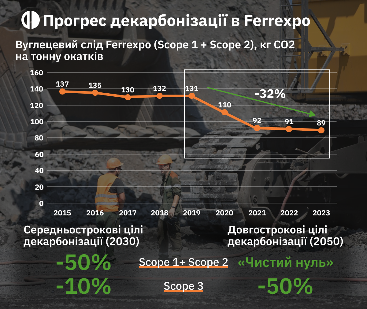 Вуглецеємність виробництва на тонну продукції, включно з викидами Scope 1 і Scope 2, знизилася на 2,2% порівняно з аналогічним періодом минулого року та на 32,1% порівняно з 2019 роком (базовий рік у стратегії декарбонізації компанії). Керівництво компанії підтверджує, що у найближчі роки можливе подальше скорочення викидів вуглецю, однак затяжна війна створює невизначеність стосовно подальших досягнень у сфері декарбонізації.