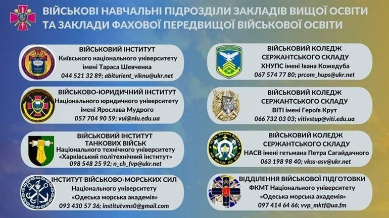 Крім того, у Кременчуцькому РТЦК зазначають, що приєднатися до військової спільноти можна і шляхом вступу до вищих військових навчальних закладів. Навчання у військових закладах освіти — це можливість отримати звання офіцера та працювати безпосередньо на Перемогу в лавах Збройних Сил України.