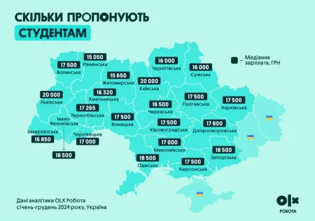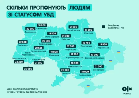 Як йдеться в аналітиці OLX Робота, медіанна зарплата в Україні станом на кінець 2024 року становила 20 000 грн ($480), що на 12,5% більше, ніж торік. Річна інфляція за цей час склала 11,2%.