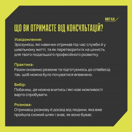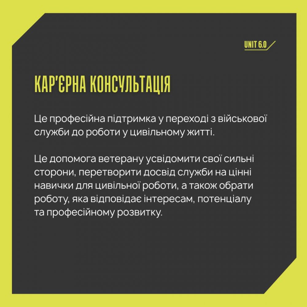Кар’єрна консультація — це професійна підтримка у процесі переходу з військової служби до роботи у цивільному секторі. Це допомога ветерану усвідомити свої сильні сторони, отримати впевненість та перевести досвід військової служби на цінні навички для роботи у цивільному секторі, а також обрати професію та місце роботи, які відповідають інтересам, здібностям, потенціалу та підготовці ветерана.