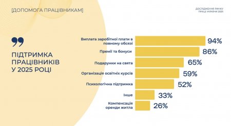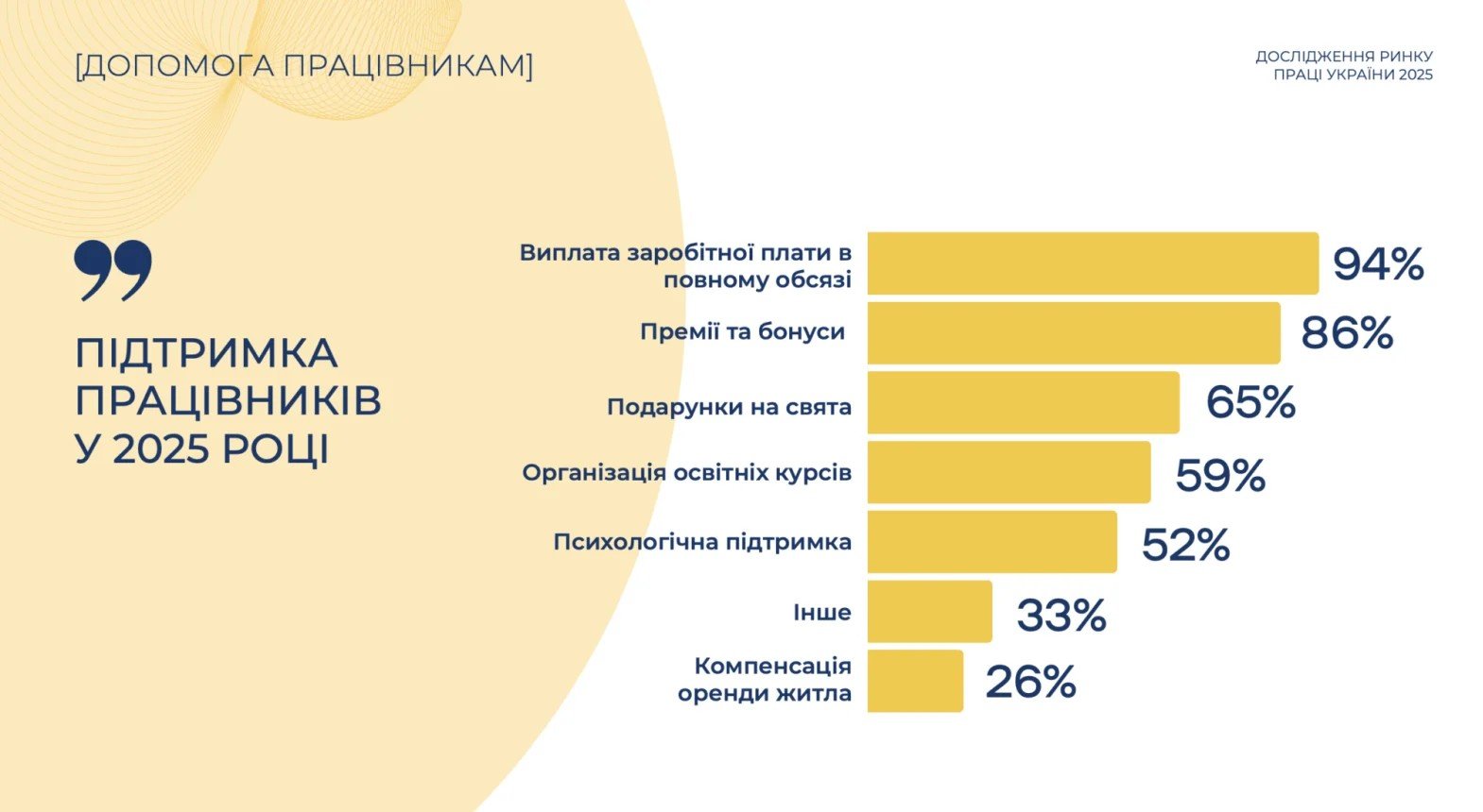 Компанії відзначають, що у 2025 році ключовими способами підтримки працівників залишалися повна виплата заробітної плати та виплата премій. У повному обсязі зарплату виплачували 94% роботодавців, а премії — 86%.