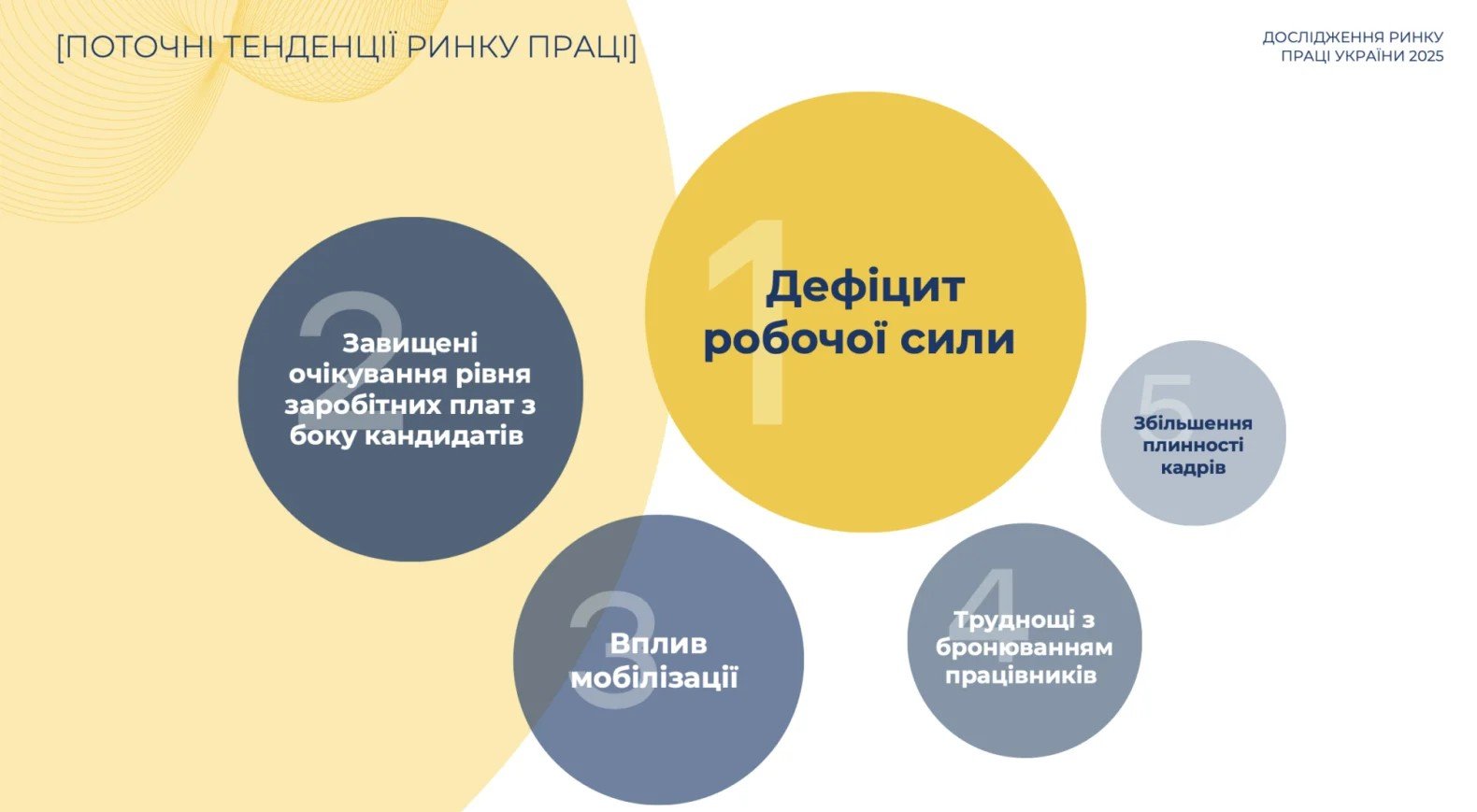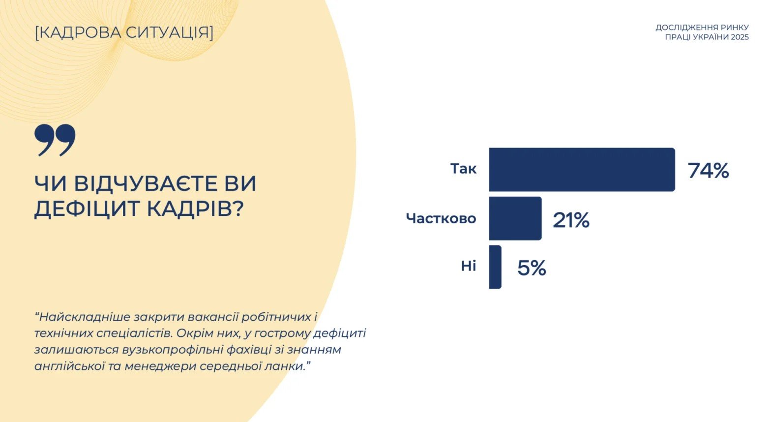 Попри зусилля бізнесу, дефіцит кадрів залишається однією з найгостріших проблем. У 2025 році 74% компаній відчували значну нестачу працівників, 21% — часткову. Лише 5% не мали труднощів із пошуком персоналу.