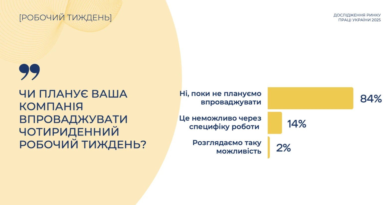 Щодо можливості впровадити чотириденний робочий тиждень, 84% компаній поки не планують впроваджувати такі зміни і тільки 2% розглядають таку можливість. Для 14% — це неможливо через специфіку роботи.