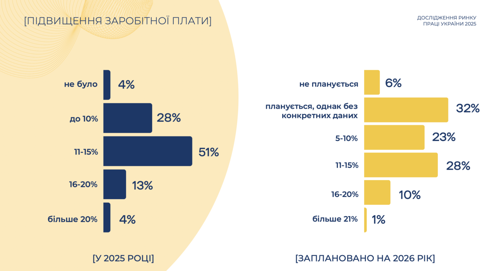 Лише 6% компаній не мають наміру підвищувати заробітні плати у 2026 році. До прикладу, у 2025 році 96% компаній підвищили заробітні плати, здебільшого на 11−20% (64%) або до 10% (28%).