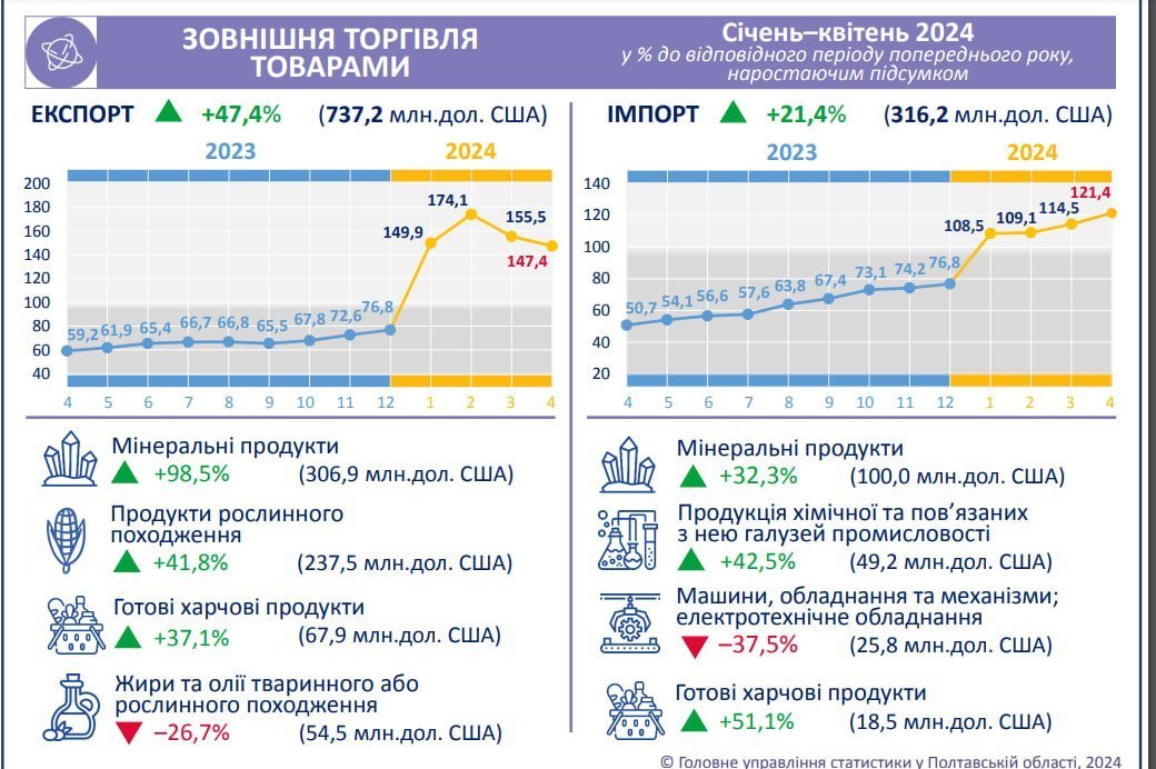 На початку 2024 року імпорт та експорт товарів Полтавщини зріс, у порівнянні з аналогічним періодом 2023 року. Відомо, що експорт зріс майже на половину, а імпорт — на понад 20%. Про це повідомили на сайті Головного управління статистики у Полтавській області 17 червня.