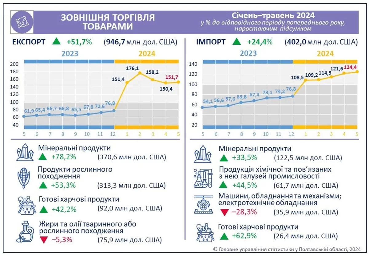 Найбільше Полтавщина експортує продукцію виробників аграрної галузі й харчової промисловості (понад 52%), а також гірничодобувної (39%). На Полтавщині збільшилась частка імпортних продуктів, вказано у статистиці.