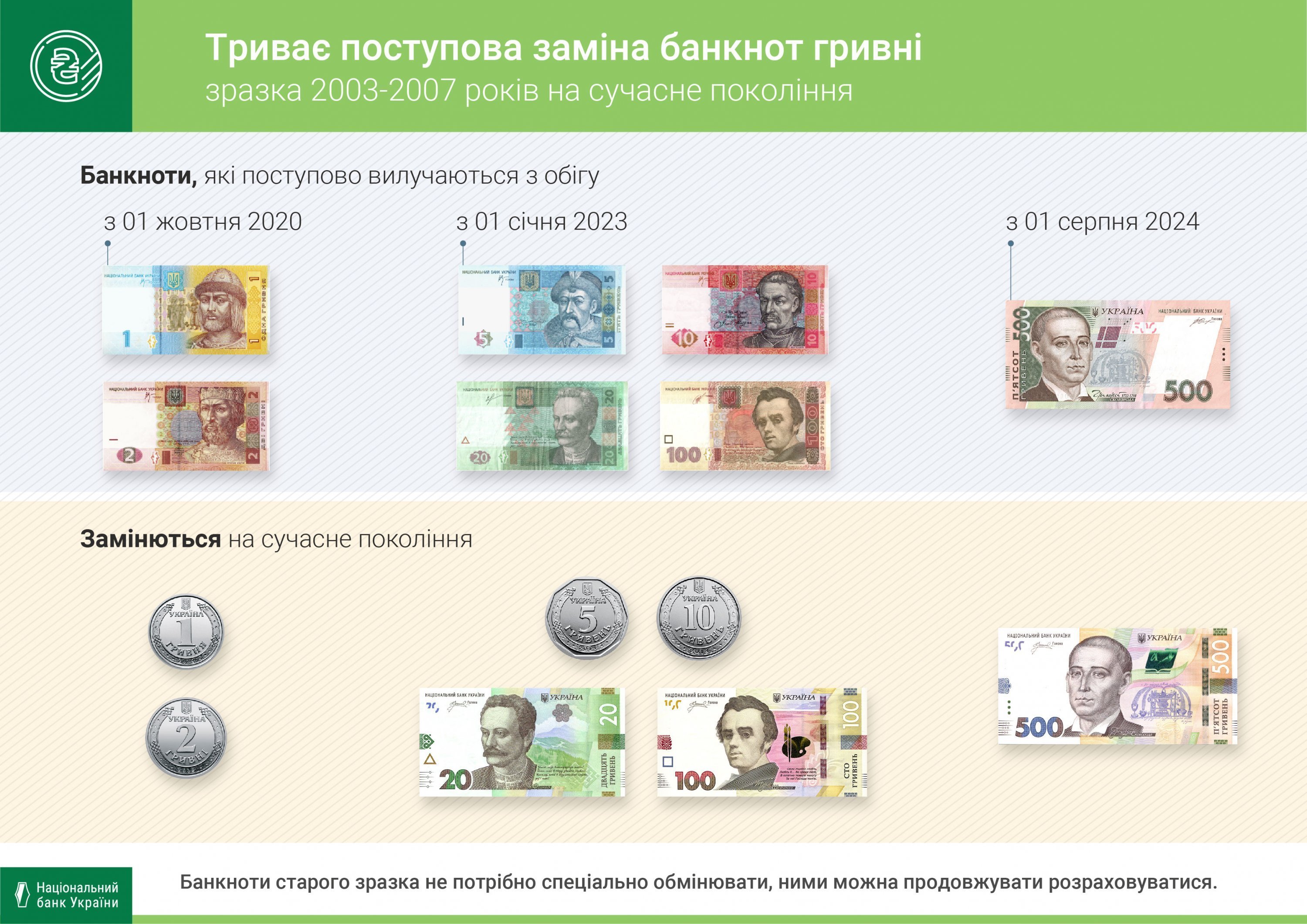 З 1 серпня 2024 року НБУ спільно з банками поступово вилучатиме банкноти номіналом 500 гривень старого зразка з готівкового обігу. Це включає: