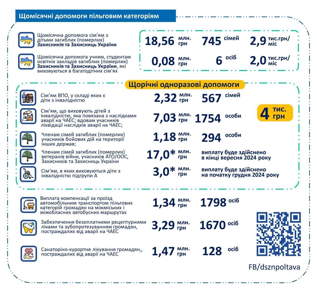 Крім того, програма передбачає також щорічні одноразові виплати й компенсації. Безкоштовну допомогу отримують і постраждалі від аварії на ЧАЕС — ліки, послуги зубопротезування, санаторно-курортне лікування.