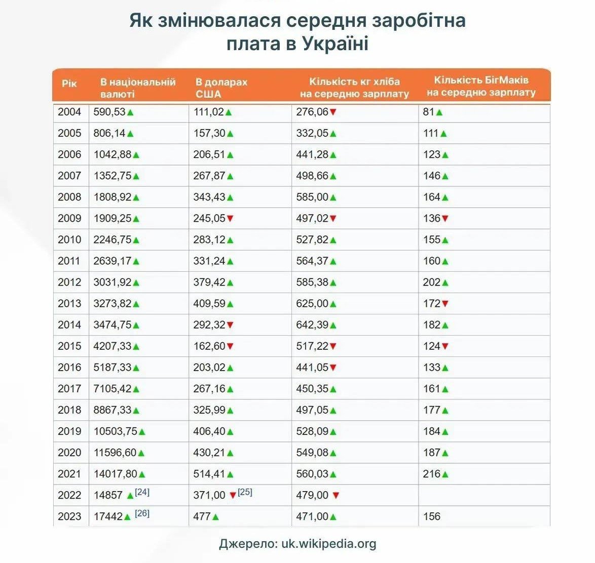 За останні 20 років середня зарплата українців у національній валюті стабільно зростала, але відповідно до долара США чотири роки спостерігалося падіння. Через девальвацію гривні у 2009, 2014, 2015 та 2022 роках середня зарплата українців у переводі на долари знижувалися, хоча у національній валюті продовжували зростати.
