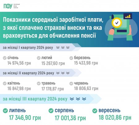 За цією інформацією, для обчислення пенсії у III кварталі 2024 року були затверджені наступні показники середньої заробітної плати, з якої були сплачені страхові внески: