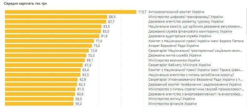 Друге місце посідає Міністерство цифрової трансформації з середнім рівнем зарплати 88,5 тис. грн (штат — 198 осіб), а третє — Державне агентство розвитку туризму — 87,7 тис. грн (22 особи).