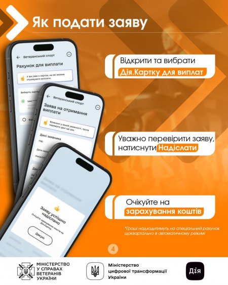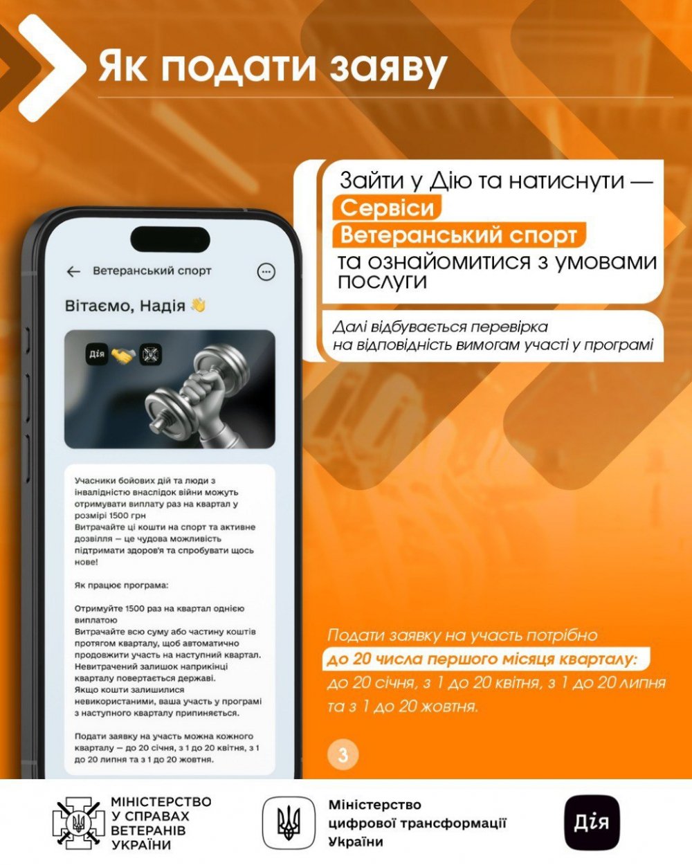 З 15 січня розпочався прийом заяв на виплату фінансової допомоги ветеранам війни для заняття спортом у застосунку «Дія». Для отримання коштів на перший квартал заявку потрібно подати до 20 січня